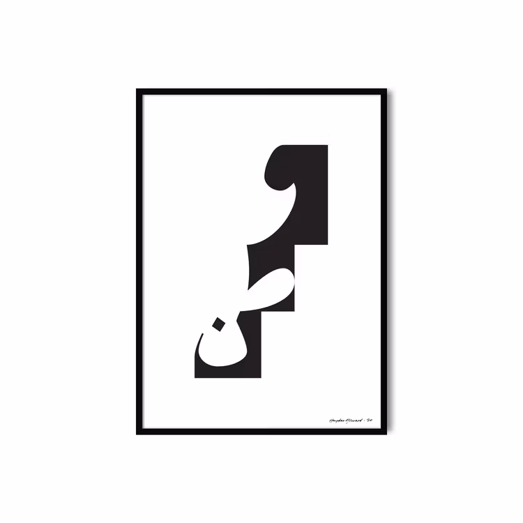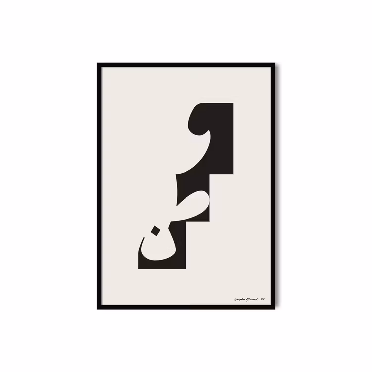 Grafisk illustration av ordet ('watan) som betyder hemland. Former i svart på en vit eller beige bakgrund. En stilren poster i minimalistisk anda. Passar perfekt till vardagsrummet i det moderna, avskalade hemmet.